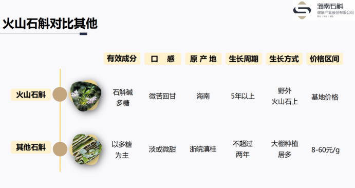 石斛—顾名思义是生长在石头上的植物。海南羊山地区具有其他地区无法复制的得天独厚的生态环境和火山岩地貌优势,年平均气温24摄氏度,空气中负氧离子含量高,地上火山石富含硒、锶、镁等微量元素……为石斛回归自然,回归石头上生长提供了绝佳的生长环境,造就了海南火山石斛的独特品质。