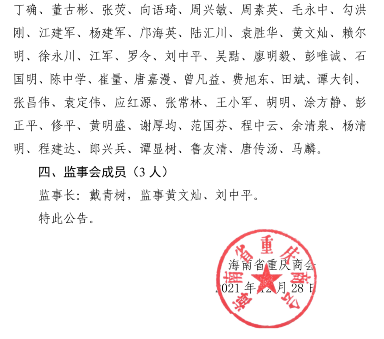 根据海南省重庆商会章程,经第二届第一次会员大会会议选举,产生了商会第二届负责人、常务理事会、理事会和监事会。现将各机构组成人员名单公告如下:一、负责人(12人)...